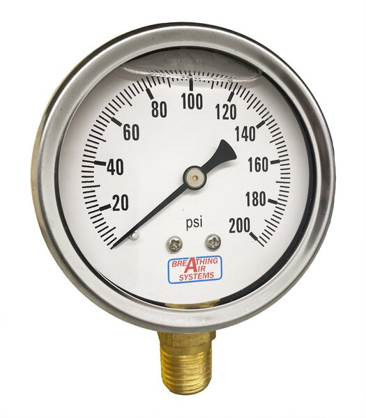 Part# 7011-200 Low Pressure 0-200PSI Bottom Stem Mount Air Pressure Gauge for Bauer Breathing Air Compressors. Pressure Gauge Specs: 2 1/2" FACE, 1/4" MNPT, BOTTOM STEM MOUNT, Glycerin Liquid Filled. All replacement products are manufactured to meet or exceed the specifications of the original equipment manufacturer. MADE IN USA. This Gauge will work with the # RVB Rubber Gauge Boot.